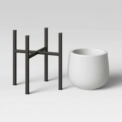 Add a stylish lift to your house plant display with this White Ceramic/Metal Planter Stand from Project 62™. This ceramic and metal planter makes a great addition to your home decor. It features an attractive glazed white pot with a rounded bottom for fresh, chic style. This freestanding ground planter rests on a sleek black metal stand to add some height to a favorite house plant, making it great for helping your snake plant or small potted tree catch a little more light from taller windows. Whether you display it solo or use it to vary height among a cluster of plants in a corner, you’ll love the look this ceramic and metal plant stand adds to your decor.