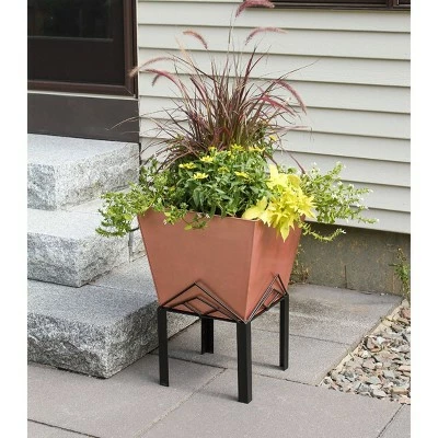 The geometric Marion Planters from Achla Designs have a simple architectural detail characteristic of the Prairie Style, equally at home on the porch of a Craftsman bungalow, desert patio or tropical lanai. These boxy faceted planters are ideal for showing off a sculptural container mix, cactus or prized bonsai. Stands are sturdy one-piece construction, in two sizes, 14 ½ -in with low planting container or 23-in with tall planter. Marion Planter pots are made from Copper plated galvanized steel, with wrought iron stands powder coated in Black. All of our Solaria Collection plant stands and hangers are designed for indoor and outdoor use, with materials and finishes for maximum weather resistance.
