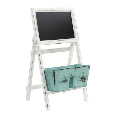 The light blue paint of the two included bins paired with the distressed white paint of the chalkboard stand ensures that this piece will look great in any room that has a rustic theme. Standing at just 26 inches, its the perfect size for any young artist in your life. Place it next to a low window so they will have plenty of inspiration for their next masterpiece. Recommended for indoor use or a covered, protected outdoor location.