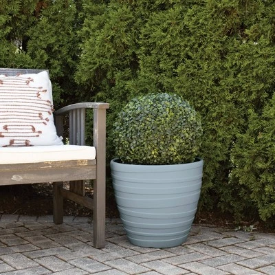 Beautify your patio or garden with the 16 inch Angled Ring Decorative Planter from Suncast®. This planter is durable and constructed of weather-resistant resin that retains moisture better than standard clay pots. Featuring a modern style and a multi-textured finish. Great for both indoor and outdoor settings. This planter is the perfect way to showcase your flowers or leafy plants.