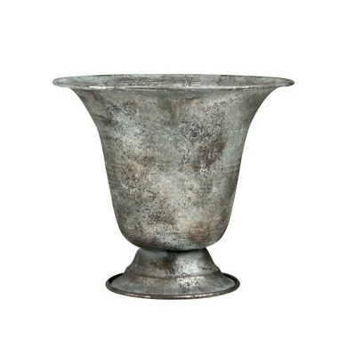 This elegant weathered urn is sure to bring a bit of vintage charm to any of your favorite living spaces. Perfect for your favorite fresh or artificial plants. Product Features: Weathered gray silver and verdigris green urn Features a curved tapered designDoes not include drainage holesClean after each use with mild soap and pat dry with a clothRecommended for indoor or outdoor covered areaDimensions: 6.75″H x 8.25″W x 8.25″D Material(s): metal