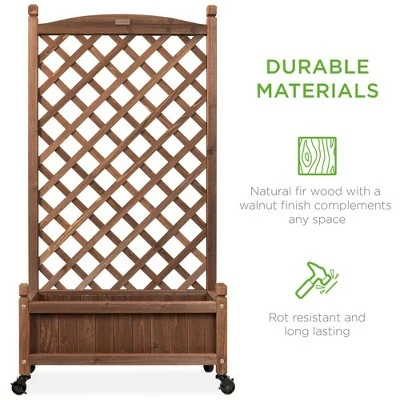 Cultivate a garden nook with this versatile 2-in-1 planting accessory that features a lightweight design suitable for any indoor or outdoor space. Made of natural fir wood with a walnut finish for a rot-resistant, long-lasting build that complements any space. A 10in-deep planter box allows you to create a soil bed or rest your favorite potted plants while a built-in diamond lattice adds stability for climbing plants and hanging baskets. Add the four included wheels to conveniently move your planter across your yard for better sun or shading.