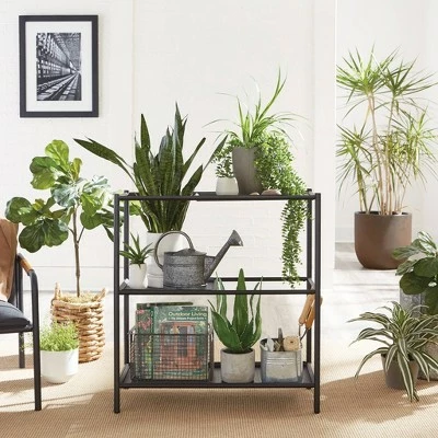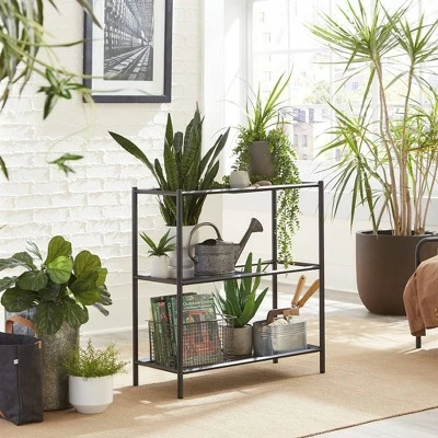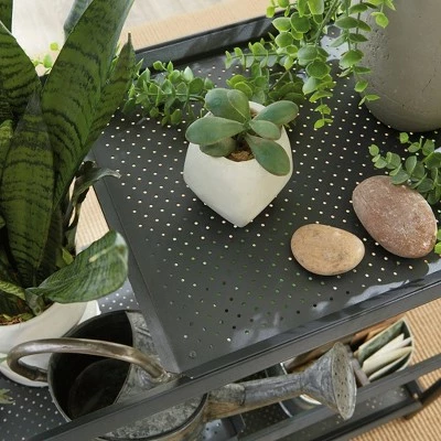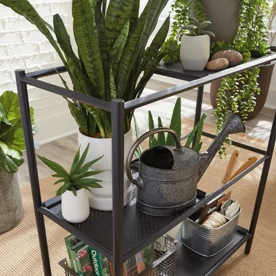 Calling all green thumbs, meet your new favorite piece of furniture. You finally have a place to display all your favorite pieces of greenery on this versatile plant stand from the Boulevard Cafe collection. This multi-purpose shelving solution features three uniquely spacious shelves/trays that provide you with the ideal amount of space to showcase your favorite plants. The two perforated trays can be positioned at any level, on either side, for the best display of your greenery. Its durable, powder coated metal construction ensures that this sturdy stand will be able to hold all your plants and look good while doing it. Its multipurpose design allows this stand to be used for more than just plants though. Use it in any room of your home like the living room, entryway, or down the hallway. It looks great no matter where it stands! Finished in black, this multifunctional plant stand is just what your home is missing.