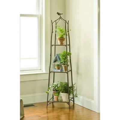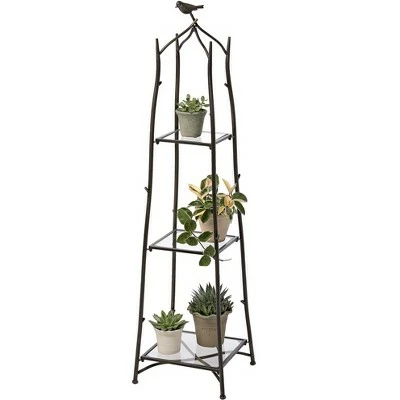 Plants and cherished curios take center stage when displayed on this handsome, nature-inspired plant stand. The sturdy steel frame has a rustic bronze finish and holds three glass shelves. The compact footprint fits easily into any indoor living space, and is ideal for use in a corner. 52″ H; folds flat for easy storage. A customer favorite!