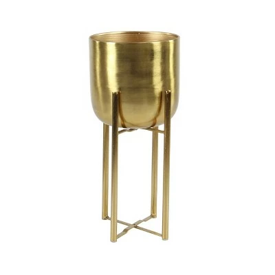 Give some gilded love to your home with this pair of tall, metallic gold planters in gold metal stands. Completely iron construction means lightweight, durable, and safe from the elements when placed outside! Deep, round planter bodies will beautifully display your pothos plants, as the tall height of the frames will let the leaves cascade without crowding. Neutral yet stunning metallic gold finishes complement any pattern or color palette while adding some pizazz to your indoor or outdoor sanctuary. These glam plant stands are AMA-ZEN. Indoor and outdoor friendly, so display your favorite greenery at your front door, living room, bathroom, bedroom, patio, or deck! Feature clear rubber stoppers beneath each leg to prevent scuffing and sliding. Wipe clean with a dry cloth. Suitable for indoor and outdoor use. Made in India. No drainage holes. Set includes two gold plant stands. Glam inspired. This item comes shipped in one carton.