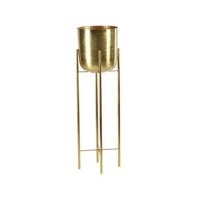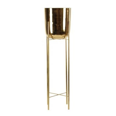 Elevate your plants, literally and figuratively, with this set of 2 large round metallic gold planters on stands. The large round bodies are great for large plants to sturdily sit on the tall metal frames with X-shaped bases. The staggered sizes look chic as a side-by-side set or separate indoor and outdoor for some glam plant looks. Now it’s time to pick out your plants! Ideal for elegant modern and contemporary spaces, both indoor and outdoor friendly Wipe clean with a dry cloth. Suitable for indoor and outdoor use. Made in India. No drainage holes included. Each set comes with 2 gold planters with stands in varying heights. Glam inspired. This item comes shipped in one carton.