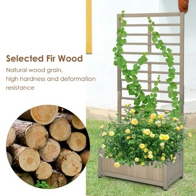 Light up your outdoor space with our wood garden bed! . Made of selected fir wood with painted finish, the garden bed has the characteristics of good toughness and deformation-resistant. Large planting area is suitable for cultivating various flowers while the trellis provides sufficient growing space for climbing plants. Designed with removable bottom base, the planter box is beneficial for the roots to go further into the ground. The hollow-out wood slats ensure good air permeability and make it easy to empty excess water. Moreover, the classical style of this planter box matches well with different places, such as garden, backyard, balcony, etc. Just enjoy your garden time with our planter box. . Specification: Color: Grey. Material: Fir Wood. Overall Dimension: 31.5”(L) x 16”(W) x 68”(H) . Net Weight: 16.5 lbs. . Package includes: . 2 x Planter Box. 1 x Instruction.
