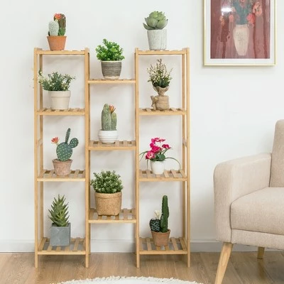 An ideal plant stand should be durable and offer great storage space. Our plant stand can meet your needs. . Its whole construction is made of natural bamboo with great durability, sturdiness and non-deformability. Thanks to this quality material, the weight capacity of each shelf is up to 22lbs/10 kg. Meanwhile, in order to create a better growing environment for plants, each layer is designed to be at a different height, which allows plants to gain full sunlight. Also, each layer is made up of some bamboo rods and there is a gap between adjacent rods. In this way, the ex ceed water will be drained in time. Of course, there is no restriction on the using places, you can place the plant stand indoors and outdoors as you want. . Specification: Color: Natural. Material: Bamboo. Overall Dimension: 45” x 11” x 32” Max Weight Capacity of Each Shelf: 22Lbs. Net Weight: 13lbs. . Package Includes: . 1 x Plant Stand. 1 x User Guide.
