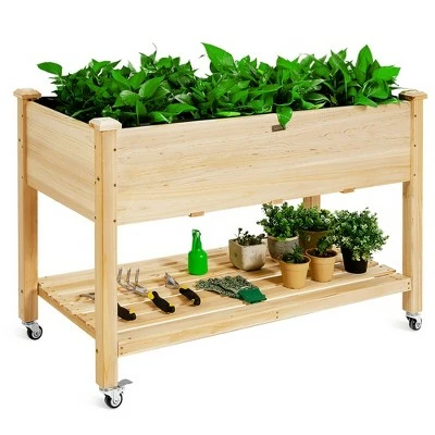 Our elevated garden bed is ideal for organizing and displaying your plants. Made of high-quality natural fir wood, this planter bed ensures solid and durable structure for long-term use. It is paired with drainage holes to drain out excess water easily. Consisting of 2 tiers, this raised garden bed is ample enough to cultivate various types of herbs, vegetables and flowers. And some of your tools, pots and soil bags can be stored on the lower shelf. Besides, it is designed in suitable height for taking care of plants conveniently and can be moved from one place to another with lockable wheels. In addition to a perfect home decoration, it can used in your garden, patio, backyard and more. Specification: Color: Natural. Material: Fir Wood. Overall Dimension: 47.5”(L) X 23.5”(W) X 33”(H). Net Weight: 35lbs. Weight Capacity of Planter Bed: 330lbs. Weight Capacity of Shelf: 110lbs. Package includes:. 1 X Planter Bed. 1 X User Guide.