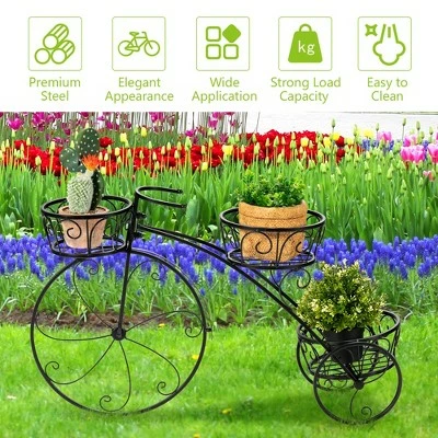 - 3-Tier Tricycle Plant Stand: Wrought iron flower plant stand features 3 round shelves, which beautifully displays your ferns, succulents, tulips, narcissus and other lovely potted plants. The basket-style design prevents plants from falling accidentally and enhances the look of your garden or outdoor.