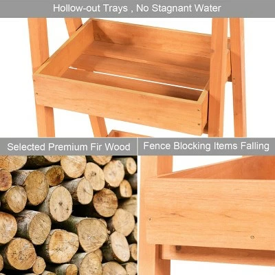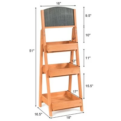 Don’t leave your plants alone on the floor, prepare a home for them! Our shelves is made of solid wood, it’s solid, durable and environment friendly. 3-tier structure gives you more spaces for more plants. At the same time, it not only lightweight but also just takes up a less ground space. It has a lot of safety designs, such as triangular structure which can increases stability, every slatted shelf has four borders which can prevent the plants fall from anywhere. The slat design not only can increases the circulation of air and ensures breathability of the plants, water comes out of the bottom of the pot to automatically water the plants below. By the way, our shelves don’t fear water because the surface of the flower rack is painted with waterproof water-based paint. Our flower pot shelf stands are for indoor and outdoor use, with this shelf, your home will become tidier.. A-Frame Sidewalk Menu Chalkboard Sign Wooden With 3 Plant Display Shelf Shelves. Specification: Color: Natural . Main material: Fir. Overall size: 18” x 16.5” x 51” (L x W x H). Net weight: 12 lbs. Maximum loads: 66lbs. Interval height: 10”, 11”, 15.5”. Load-bearing capacity of each layer:22lbs. . Package includes: . 1 x 3-Tier flower wood rack. 1 x Instructions.
