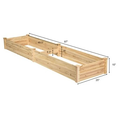 Our 8ft x 2ft vegetable bed is perfect for growing your vegetables and flowers. The vegetable bed allows enough space between each vegetable, so they can grow efficiently. The boards are made of 0.5 inch thick Cedar wood that is built to last through the seasons. There is a divider in the middle of the box, so you can plants two different plants in it. With this planting box, you can plant any vegetables as you want, and you can use this bed on your backyard, lawn, or garden. If you are plan to plant something, do not miss this planting box.. Specification: Material: fir wood. Thickness of board: 0.5″. Dimensions: 97” x 25” x 10”(L x W x H) Each box dimension: 48″x24″x10.0″(LXWXH) . Product weight:21.56lbs. Package include: 1 x vegetable planter