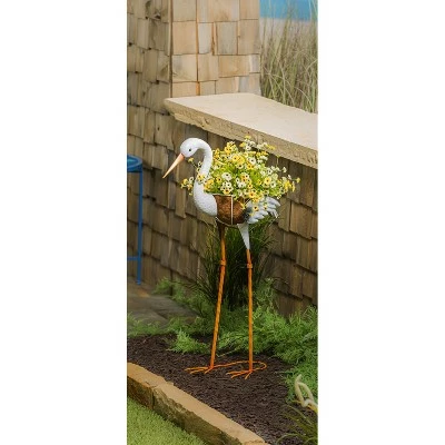 Add coastal flair to your outdoor space with this Metal Heron Garden Planter with Cocoliner. This heron design boasts a sleek white finish and bright orange legs with a planter to replace the body. A coconut fiber liner is included, making it perfect for small plant displays. Standing tall and proud at approximately 35 inches, this nautical bird will add a tropical twist to any outdoor area during the spring and summer seasons. Made of metal, this stylish planter is weather and fade resistant and can be easily displayed with its sturdy looped base. Perfect for your garden, yard, and more, this piece makes a great gift for a family member or loved one who loves herons.