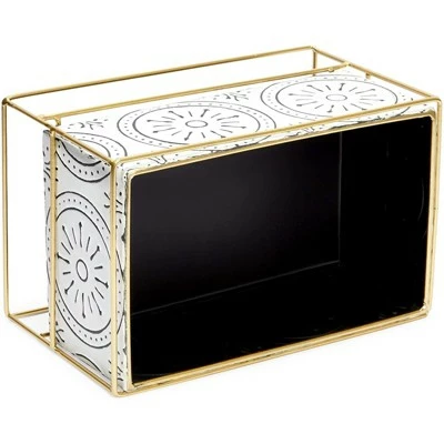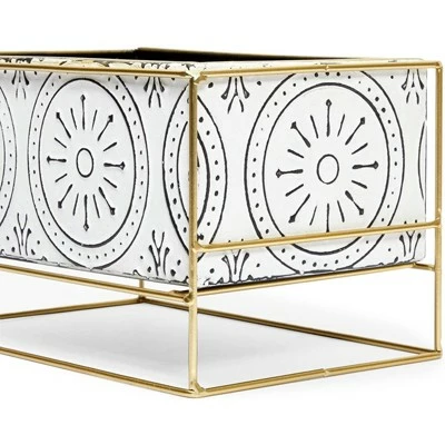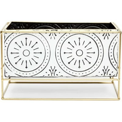 Instantly elevate your home or garden decor with this large rectangular planter that features an intricate boho design. The long flower pot is elevated on a gold metal stand, perfect for display on your desk, patio, front door entry, or balcony. The white metal planter pot with stand measures 6.5 x 10.5 x 6.25 inches, perfectly sized to grow flourishing succulents, flowers, and herbs. Plant a vibrant green houseplant in the long succulent planter to gift to a coworker, friend, or family member at an upcoming housewarming or birthday celebration!Product names are trademark of listed manufacturer or other owners, and are not trademarks of eForCity Corp. The manufacturer does not necessarily endorse use of these products.
