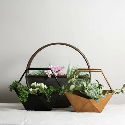 - Style: This geometric planter features a distressed galvanized metal finish with a rust color along the rim or a sleek black or bronze finish. This planter pairs well with your favorite farmhouse décor and is ready for live, dried or artificial florals.