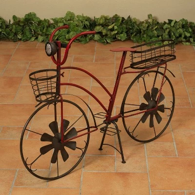 Take your favorite potted plants and flowers for a ride on this antique-styled, 37-inch long bicycle plant stand. Durably-constructed of metal in a classic, antique-styled bicycle design, this charming plant stand has wind spinner spokes on the wheels and is painted a muted red with brown accenting. With two holders for potted plants or live flowers, one traditional shaped plant holder on the front and a longer one on the back, you can create a dazzling display. This attractive and functional plant stand even has a solar-powered headlight with one energy efficient, cool white LED light and reflective plastic to dispel the darkness in your garden or yard. Intended for use outdoors, this cleverly-designed bicycle planter would make the delightful addition to your summer garden, or the perfect accent piece for your patio.