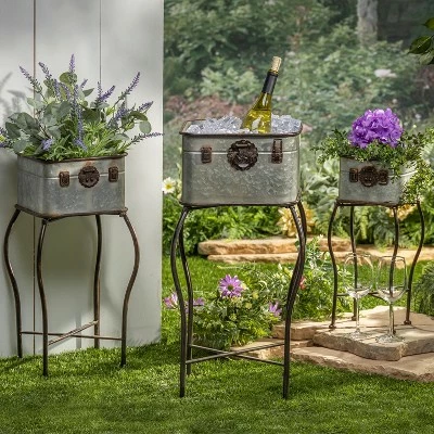 Add style and antiquity to your outdoor scene or garden with this classically-designed set of three plant holders. Set Contains Assorted Sizes: Large Stand is 13.38InL by 27.75InH, Medium Stand is 11.02InL by 23.22InH, and Small Stand is 8.46InL by 19.29InH. Artfully-crafted of galvanized metal, each square planter is accented with an antique styled latches on the front. Each planter also includes a four-prong metal stand, allowing you to choose how best to display your favorite floral arrangements: Place them together to make an outstanding centerpiece attraction, or separate them to add a beautiful accent to several areas of your home. Use these plant holders to house your favorite flowers or potted plants either in your home or garden, or to liven up your patio with a classic style that your guests will envy.