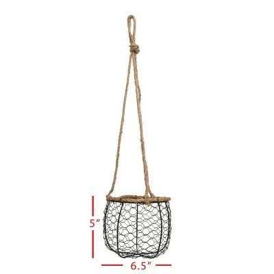 From Foreside Home & Garden, a textural hanging planter basket. Display your favorite greenery in an updated take on chicken wire in a clean black finish. The jute rope paired with the black wire offers a light rustic touch. Jute is a vegetable fiber that is made from the bark of jute plants. It is the most environmentally friendly fiber because its fibers can be recycled more than once. This basket will add unique traditional flavor to any room.