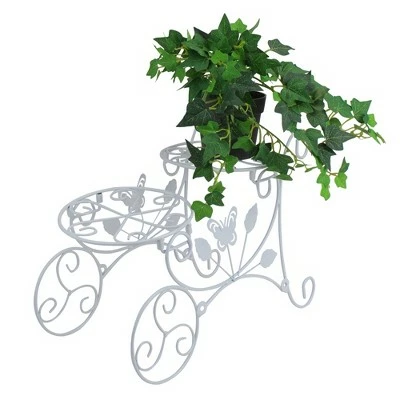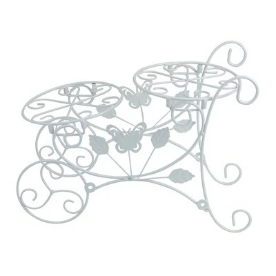 Bring timeless style to your home or patio with this endearing garden cart stand. This cart boasts two decorative (non-rolling) wheels with a striking scrollwork design that will be a perfect fit for any indoor/outdoor space. It features 2 tiers to showcase beautiful flowers, plants, yard decorations, and much more. Features:Metal garden cart flower pot holderFrame features scrollwork design with butterflies and leavesRecommended for indoor or outdoor decorative use onlyOffers two tiers for displaying items (not included)This item requires minimal assembly Dimensions: 14.5″D x 10.25″H x 6.75″WMaterial(s): metal