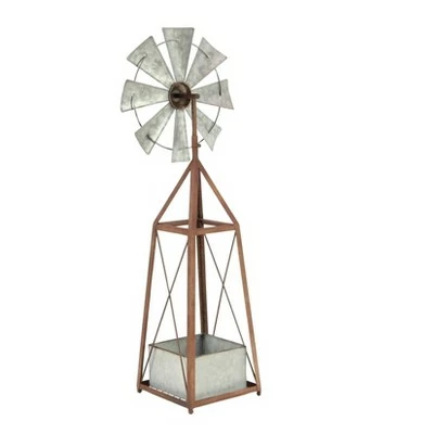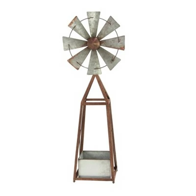 This metal windmill-inspired planter brings tranquility to your space by allowing you to fill it with plants—hence it promotes wellness and creates an immediate feeling of relaxation. This decorative planter is sure to add bundles of charm to your home. Beautifully detailed, it features gray square planter box, silver mini wheel, and brown pyramidal frame. This windmill planter is made out of iron with solid construction, offering durability. Jazz up farmhouse themed spaces using this charming accent piece that is ideal for outdoor use. A perfect complement to any outdoor area with a farmhouse design. Designed with black rubber stoppers at the base that prevent scratching furniture and table tops, as well as sliding around. Wipe clean with a dry cloth. This planter is designed with a windmill structure. Suitable for indoor and outdoor use. Farmhouse-themed style. This item comes shipped in one carton.