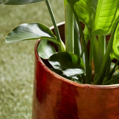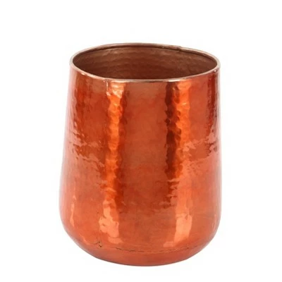 This set of three aluminum planters brings tranquility to your space by allowing you to fill them with plants—hence it promotes wellness and creates an immediate feeling of relaxation. These decorative planters are sure to add bundles of charm to your home. Beautifully detailed, the set features round aluminum planters in textured copper finish and is designed with dimpled detailing. These planters are made out of aluminum with solid construction, offering durability. Jazz up glam and eclectic themed spaces using this set of charming accent pieces that are ideal for outdoor use. These stunning decorative planters are ideal for earth-toned furniture and living spaces Wipe clean with a dry cloth. Suitable for indoor and outdoor use. Made in India. Pots have no drainage holes. These planters come as a set of 3. Glam inspired. This item comes shipped in one carton.
