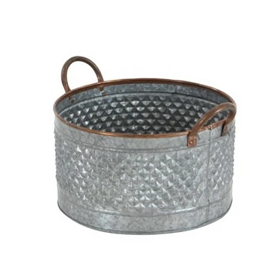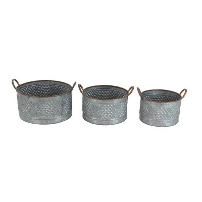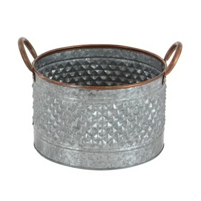 This set of round metallic planters brings tranquility to your space by allowing you to fill them with plants—hence it promotes wellness and creates an immediate feeling of relaxation. These decorative planters are sure to add bundles of charm to your home. Beautifully detailed, the set features gray galvanized metal pots as well as copper brown rims and handles. These planters are made out of metal with solid construction, offering durability. Jazz up farmhouse themed spaces using this set of charming accent pieces that are ideal for outdoor use. Perfect to display in farmhouse-inspired entryway, living room, kitchen, or even outdoor spaces like patio or garden Wipe clean with a dry cloth. Suitable for indoor and outdoor use. Made in India. Pots have no drainage holes. These metal planters come as a set of 3. Farmhouse-themed style. This item comes shipped in one carton.