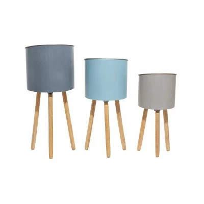 Add these charming pastel hue boho style multi-colored metal and wood can planter set in your bohemian inspired living space and see what colors can do to your home interior design. These metal and wood planters feature a tin can design planter which are raised by a tripod wooden leg design. The planter body comes in a cylindrical can design in a multi-color finish while the legs come in round wooden poles with a light brown color. This trio will look good together in any room of your boho inspired living room, dining or entry way. Ships in 1 carton. Suitable for indoor and outdoor use. No drainage holes. Each set includes with 3 planters. Typography, ‘Flowers & Garden’. Farmhouse-themed style.