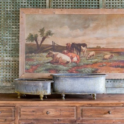 These metal oblong centerpiece planters feature a distressed matte bronze finish and claw feet. Set of 2, one smaller and one larger.