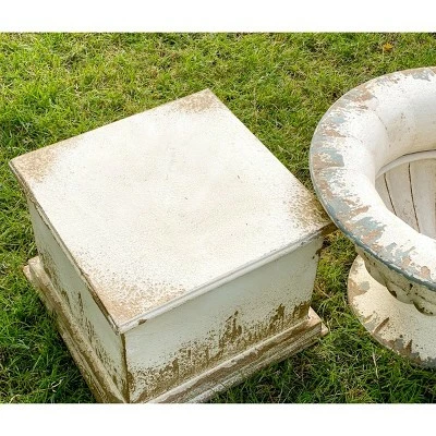 This metal manor urn sits atop a metal pedestal base and features a distressed antique white paint finish.
