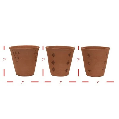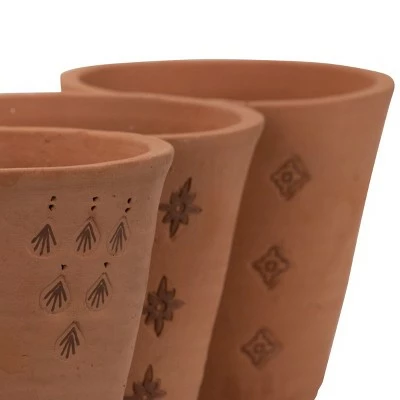 The Set of 3 Natural Hand thrown Terracotta Embossed Stamped Padma Planters offers three different complementary styles of natural terracotta pots. Hand touched at every stage by artisans in India, these planters are hand thrown, the designs are hand-stamped, and each one is finished with tonal hand-painted detailing to accent the embossed patterns.