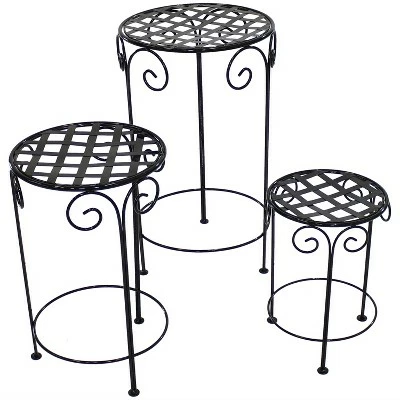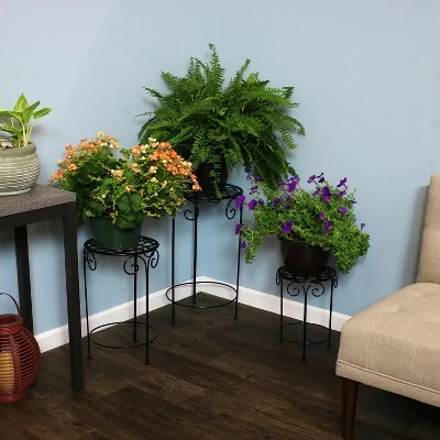 Make flowers, ferns and other plants part of the decor with this set of plant stands. Perfect indoors or outdoors, these plant stands are constructed of strong iron with a timeless black powder-coated finish. These plant stands feature a classic scroll design that will add a decorative touch. This set of three plant stands includes 1 large, 1 medium and 1 small plant stand to create a cohesive staggered look with plants. Not only can these be used to hold plants, but they can also be used as a side table to hold books or magazines.