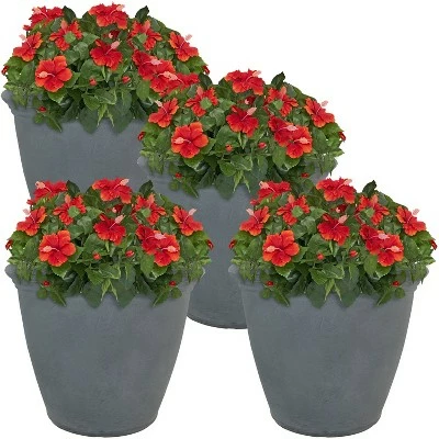 Create a beautiful accent for favorite plants in the home or garden with this large flower pot. Featuring a hand-painted finish, this planter has the charming look of a weathered container, adding rustic character wherever placed. The linear low-density polyethylene construction gives this planter the strength and durability to handle the elements. Not only can it withstand harmful UV rays, but it can also resist cracking in cold temperatures. This planter can even be placed outside in windy locations. The double-wall construction features a space that can be filled with sand or gravel to weigh down the planter so that it stays put on gusty, blustery days. Plus, the full-depth inner wall provides insulation to protect roots from changes in temperature, so plants can grow healthier. Not only can this versatile planter be used outdoors, but it also makes a beautiful decorative piece indoors too when paired with a protective saucer.