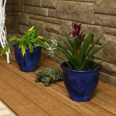 Add vibrant accents to any indoor or outdoor living space with this set of 2 Studio Ceramic Planters by Sunnydaze Decor. Available in rich color schemes, hand-painted ceramic planter with glazed finish features drainage holes making it perfect for use on the patio, deck or garden. For use indoors, please use a separately purchased saucer to prevent leakage on floors and other surfaces.