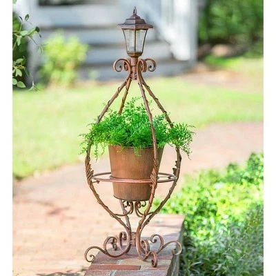 This handsome Antiqued Wrought Iron Plant Stand with Solar Light is a real beauty with a large metal bucket to hold everything from holly sprigs to springtime annuals. It stands firmly on four curled iron feet that gracefully arc up and around the planter bucket, accented with wire “stems” and artfully crafted leaves. The lantern at its top is traditional in style, but modern in technology. Powered by a discreet solar panel, it adds a charming glow after dark. Treated with an antiqued, copper-colored finish, this planter will be a truly elegant addition to a front porch or walkway. Wind & Weather Exclusive Design.