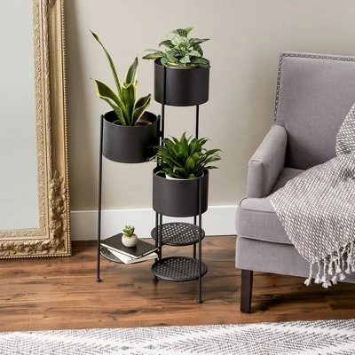 - Showcase your plants with this contemporary matte black finish 3-tier plant stand. The graceful stair step arrangement can display 3 large plants in a minimum amount of space. Additionally, 3 smaller plants can be placed on the bottom metal mesh shelves