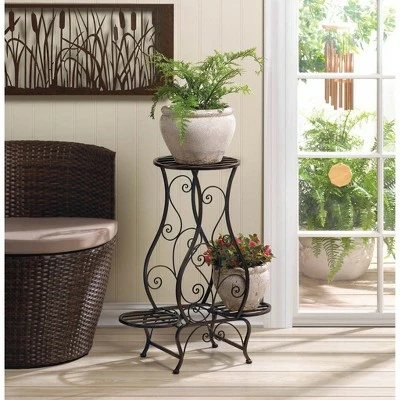 - Display your blooming beauties on a plant stand that’s just as lovely as they are! This iron stand features three slatted platforms and an alluring hourglass shape with curling iron embellishments crawling up the center. The two lower platforms hold smaller pots, while the top center platform can hold your proudest plant.
